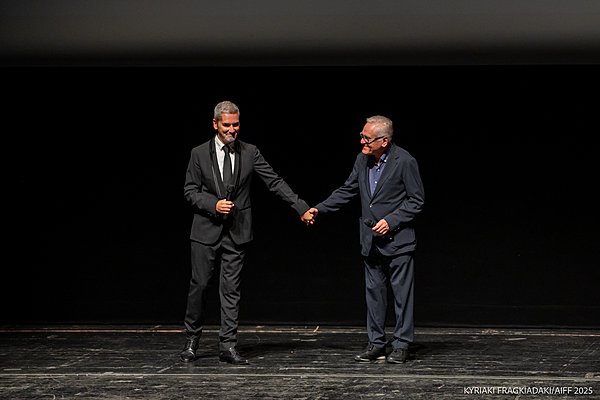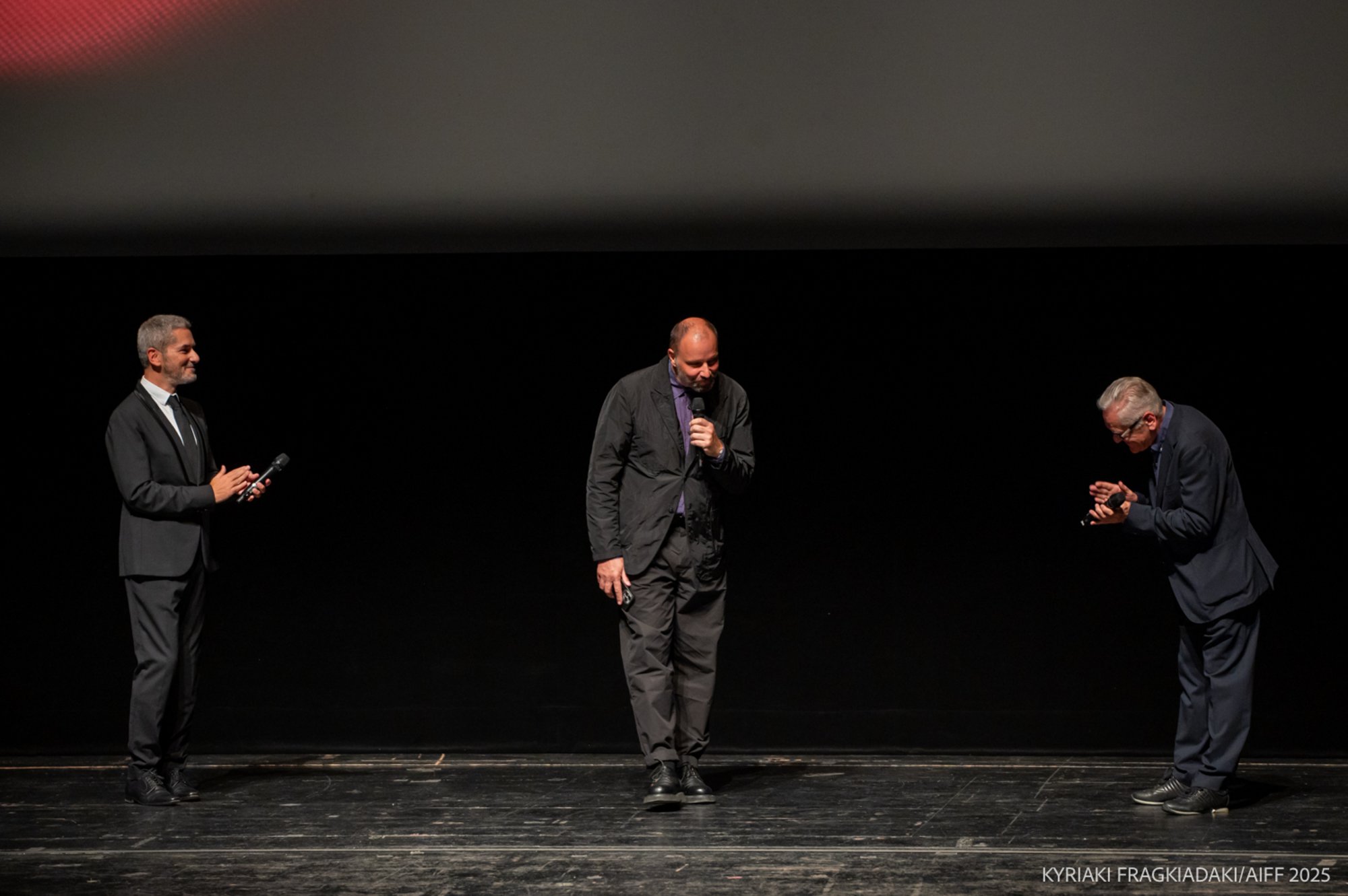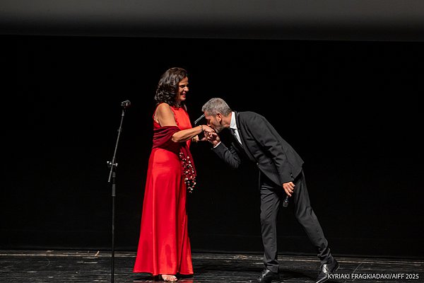 Στη συνέχεια, μίλησε με τα πιο θερμά λόγια για «έναν από τους κορυφαίους μοντέρ και καλλιτέχνες στη χώρα και το εξωτερικό, πόσο εξαιρετικό είναι το μοντάζ του στη ΒΟΥΓΟΝΙΑ, πώς φτιάχνει τόνους, ρυθμό, πώς οδηγεί το κοινό εκεί που θέλει ο σκηνοθέτης», και εκφράζοντας την χαρά και την τιμή του για την παρουσία του στο Φεστιβάλ, κάλεσε στη σκηνή τον Γιώργο Μαυροψαρίδη με το κοινό να ξεσπά σε χειροκρότημα.