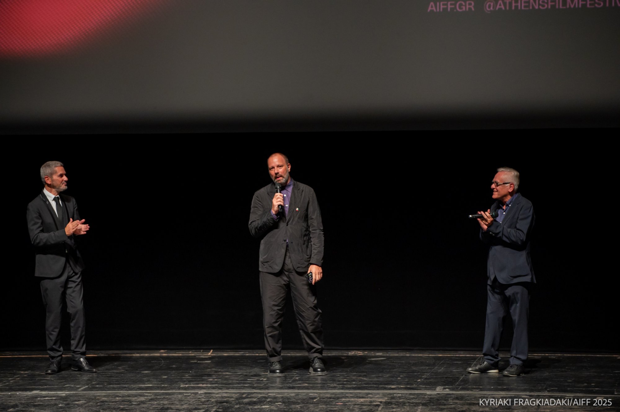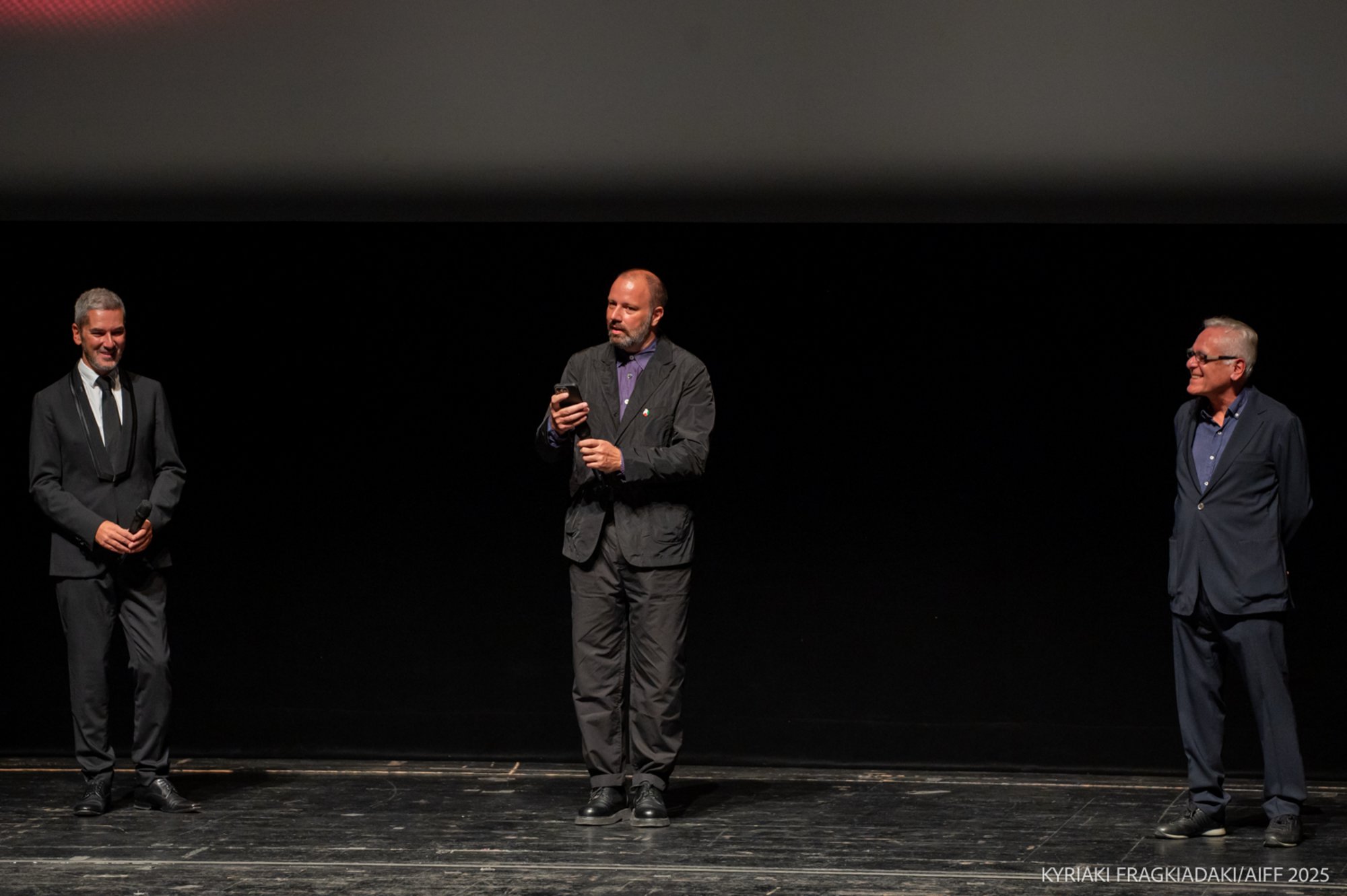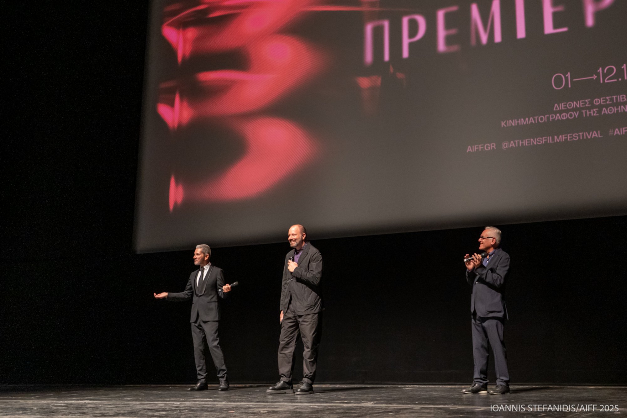 Το κοινό που κατέκλυσε την αίθουσα Τριάντη για να παρακολουθήσει την πολυαναμενόμενη πρεμιέρα στη δεύτερη μόλις φεστιβαλική προβολή της στον κόσμο, μετά την φετινή Biennale, περίμενε μια θεαματική έκπληξη: την παρουσία στη σκηνή του διεθνούς Γιώργου Λάνθιμου και του κορυφαίου συνεργάτη του, μοντέρ, Γιώργου Μαυροψαρίδη!